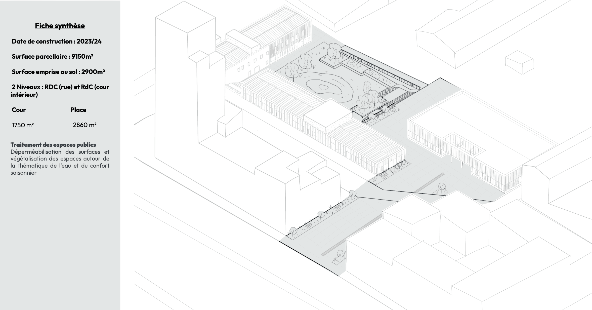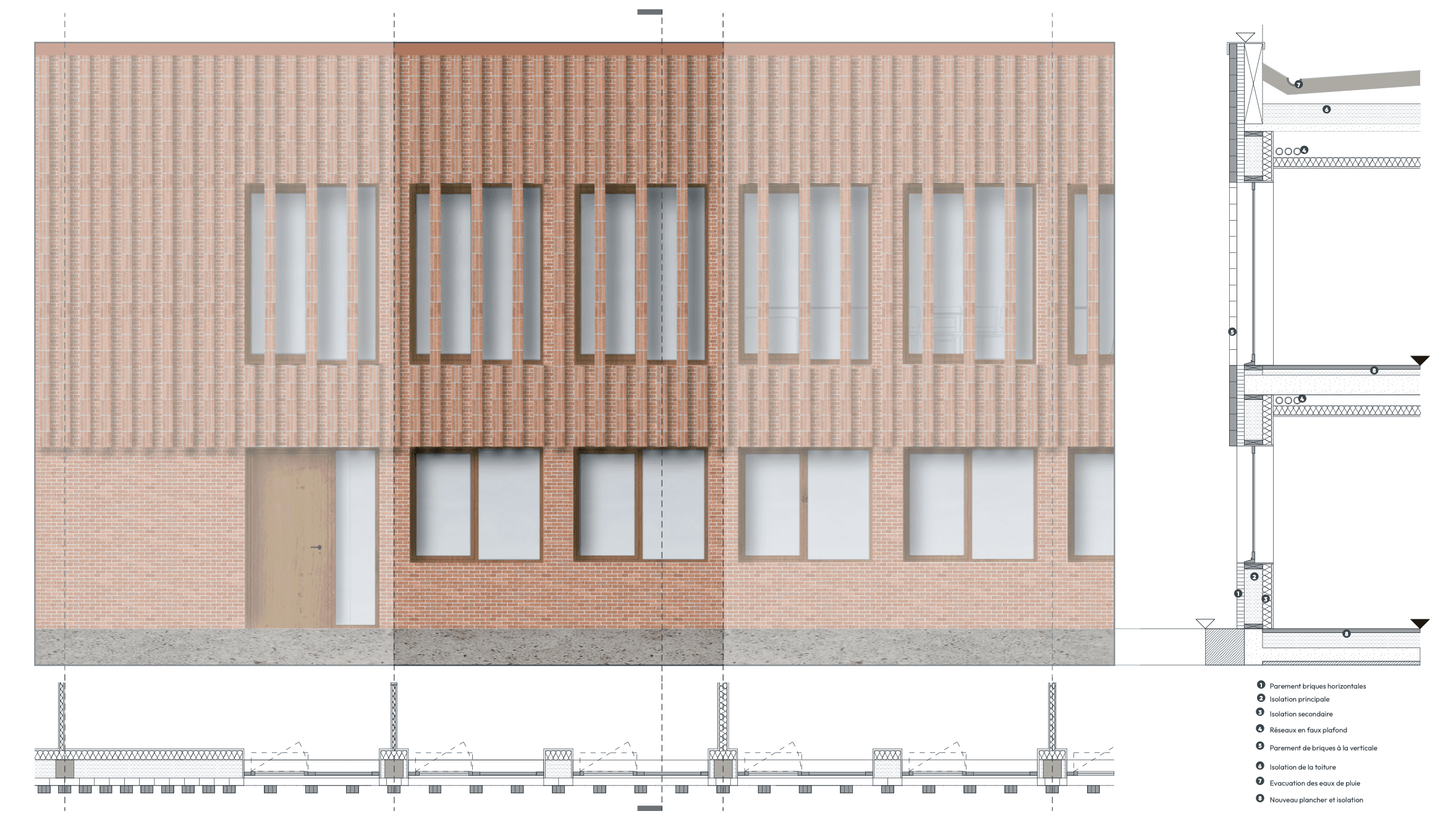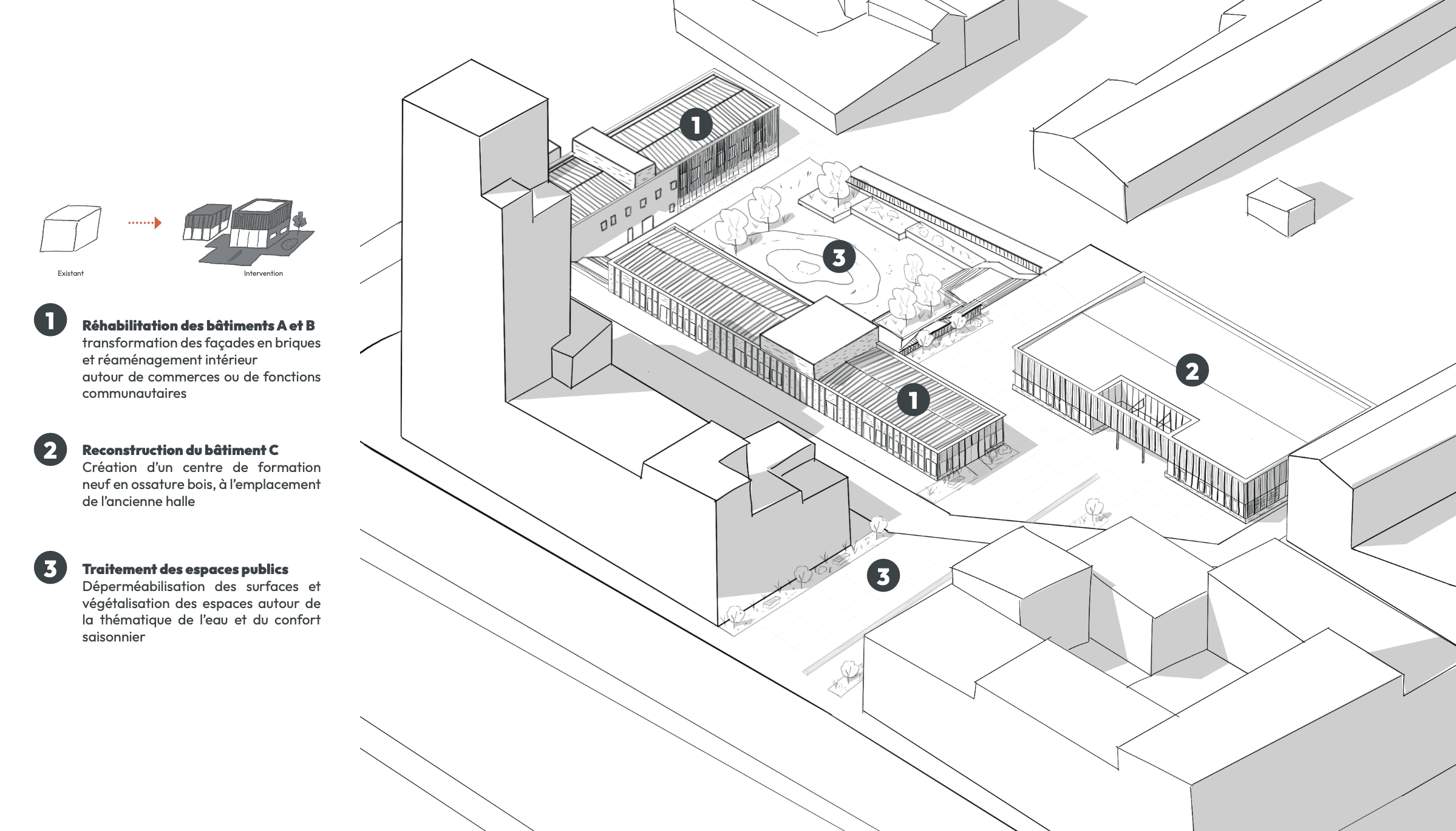 Concernant les logiques d'interventions, le projet comprendre 3 interventions différentes. La réhabilitation de 2 bâtiments sur 3, avec une traitement en particulier pour les façades et leur matérialité. Une construction neuve suite à la démolition du 3ieme bâtiment, avec un nouvrau traitement de façade et une matérialité différente mais une mise en œuvre commune. Puis un traitement paysagé progressif de la place public vers le parc, avec la présence de l'eau de la végétation comme fil conducteur ; dans un environnement sujet à de fortes intempéries et risques d'inondations.