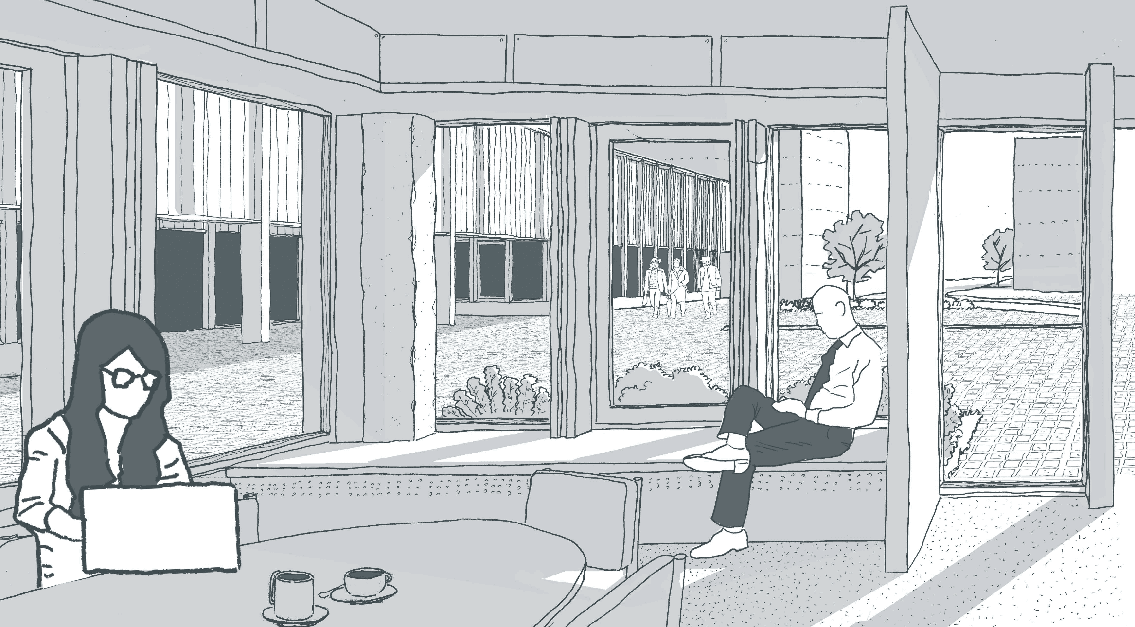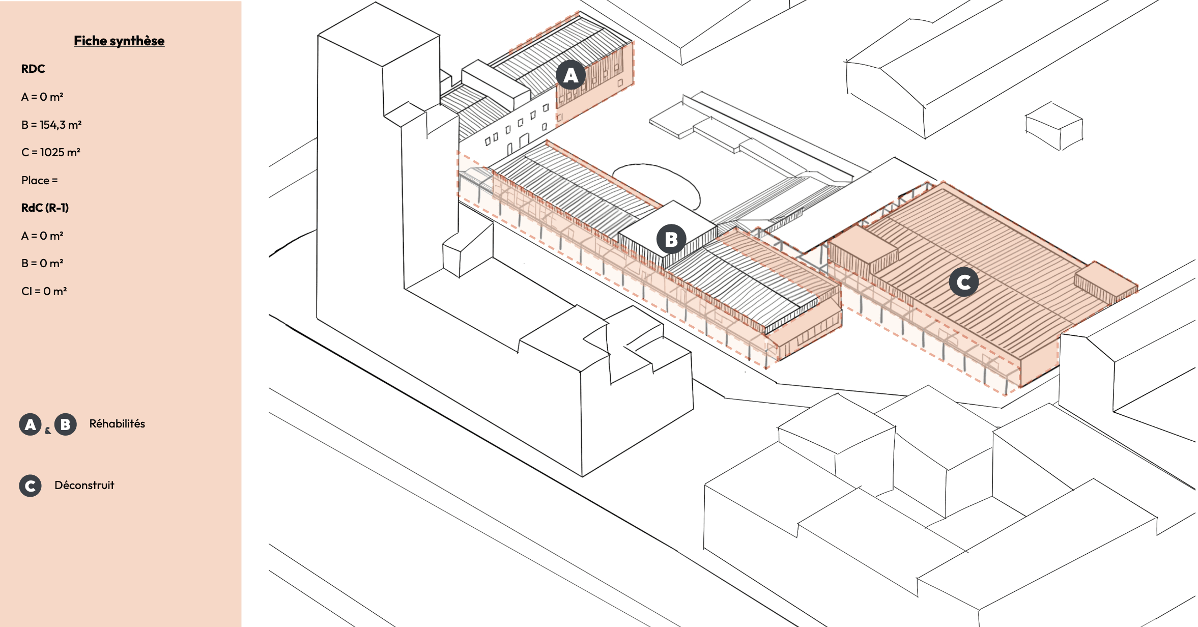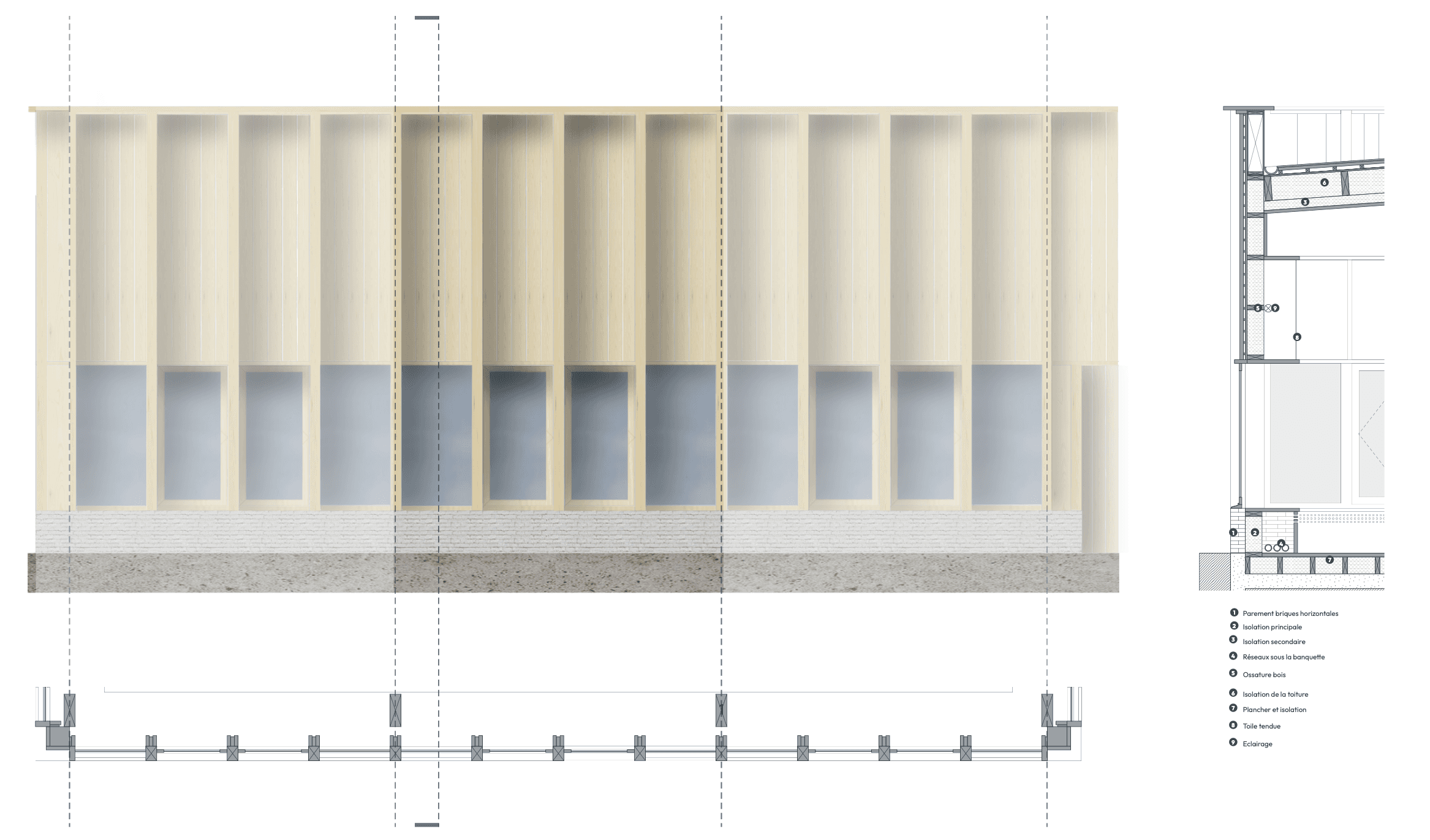 Concernant les logiques d'interventions, le projet comprendre 3 interventions différentes. La réhabilitation de 2 bâtiments sur 3, avec une traitement en particulier pour les façades et leur matérialité. Une construction neuve suite à la démolition du 3ieme bâtiment, avec un nouvrau traitement de façade et une matérialité différente mais une mise en œuvre commune. Puis un traitement paysagé progressif de la place public vers le parc, avec la présence de l'eau de la végétation comme fil conducteur ; dans un environnement sujet à de fortes intempéries et risques d'inondations.