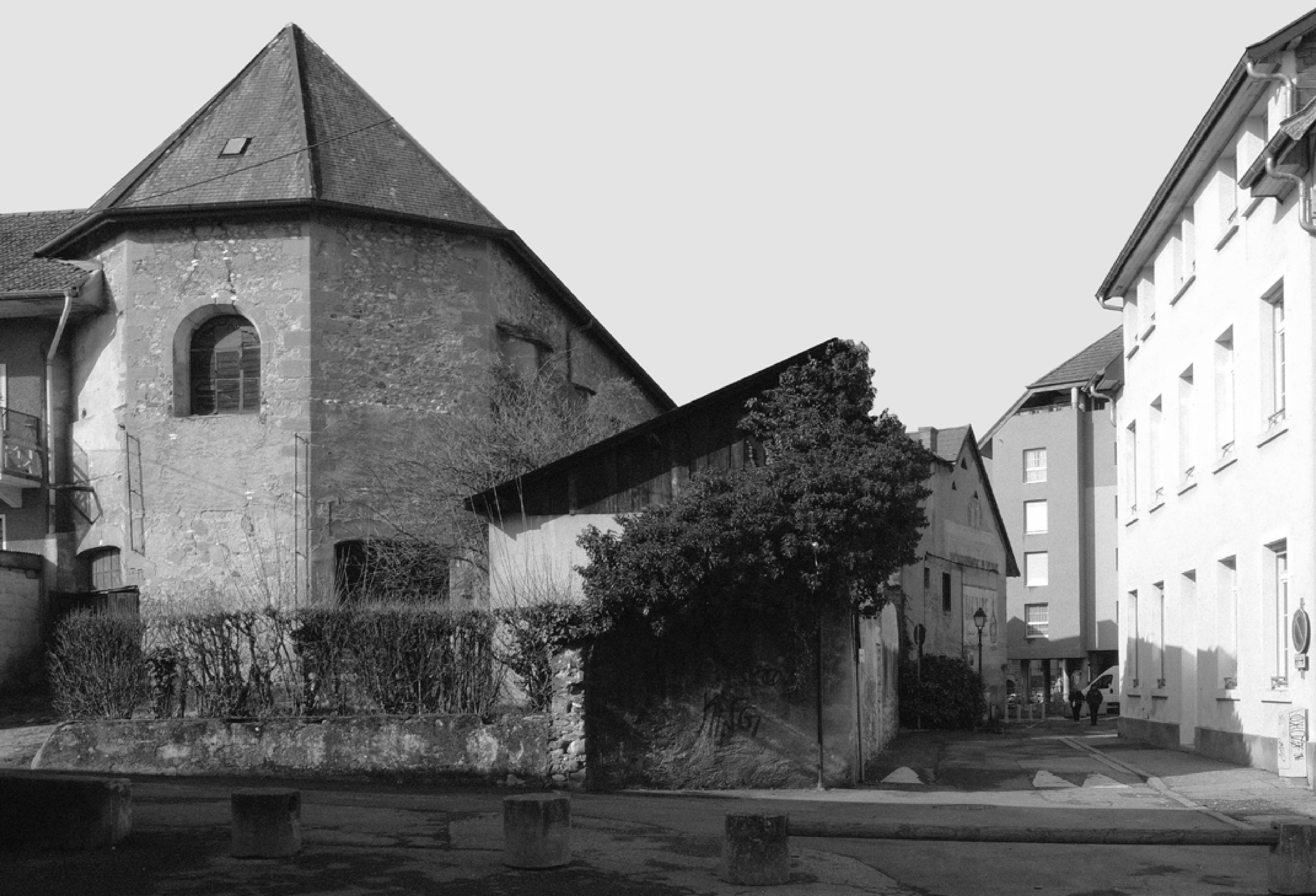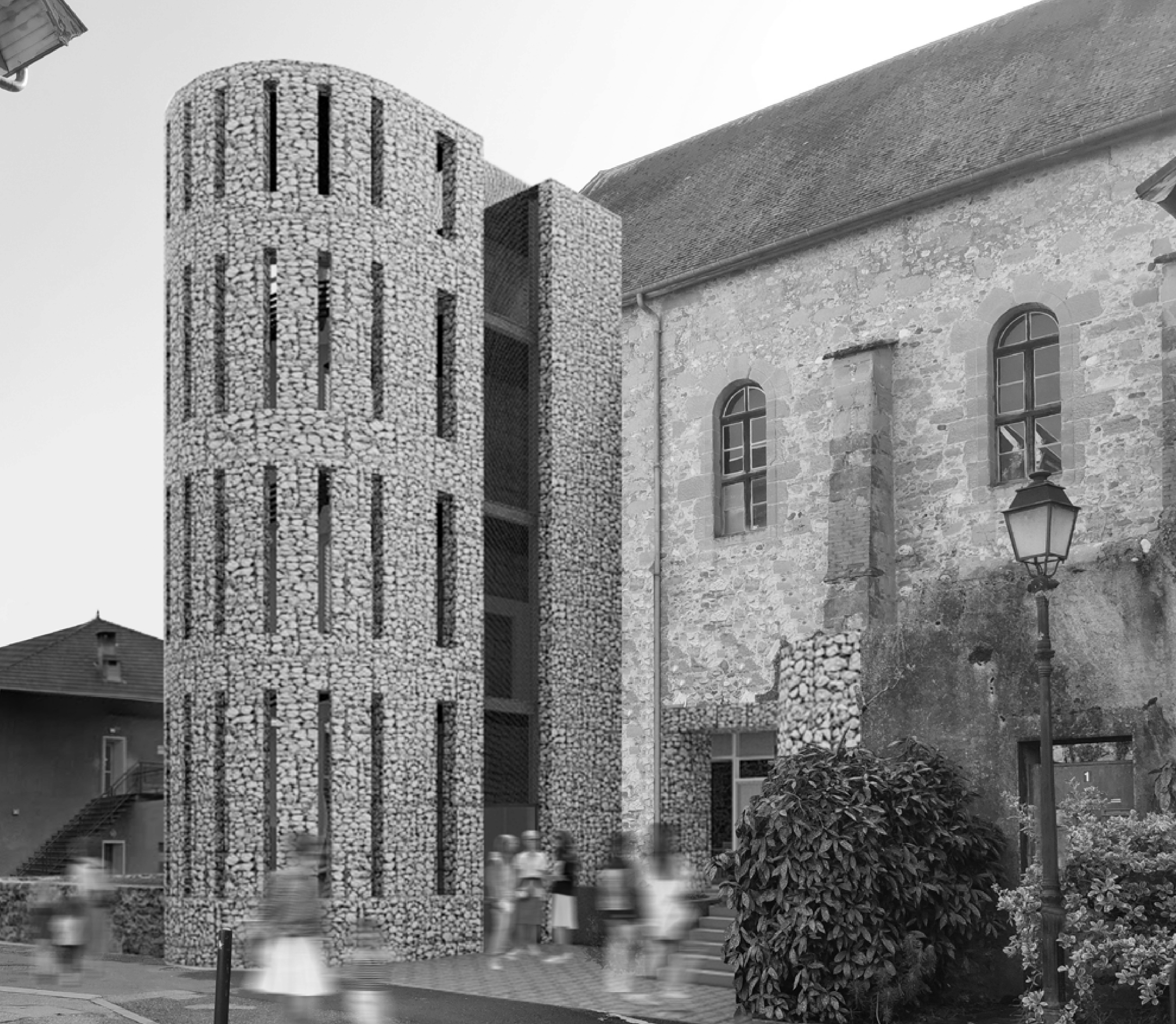 Ce clocher vient marquer la nouvelle entrée au Nord, par la rue des écoles bientôt piétonne. Son aspect massif contraste avec la structure légère à l’intérieur. Ces deux interventions cherchent à renforcer la structure aujourd’hui endommagée de la chapelle, l’ossature interne jouant le rôle de tirant. L’intervention cherche à réemployer la matière existante, par exemple les pierres du mur d’enceinte et des perforations sont réemployées dans le gabion du clocher, et les poutres métalliques du plancher intérieur sont utilisées dans la nouvelle structure.