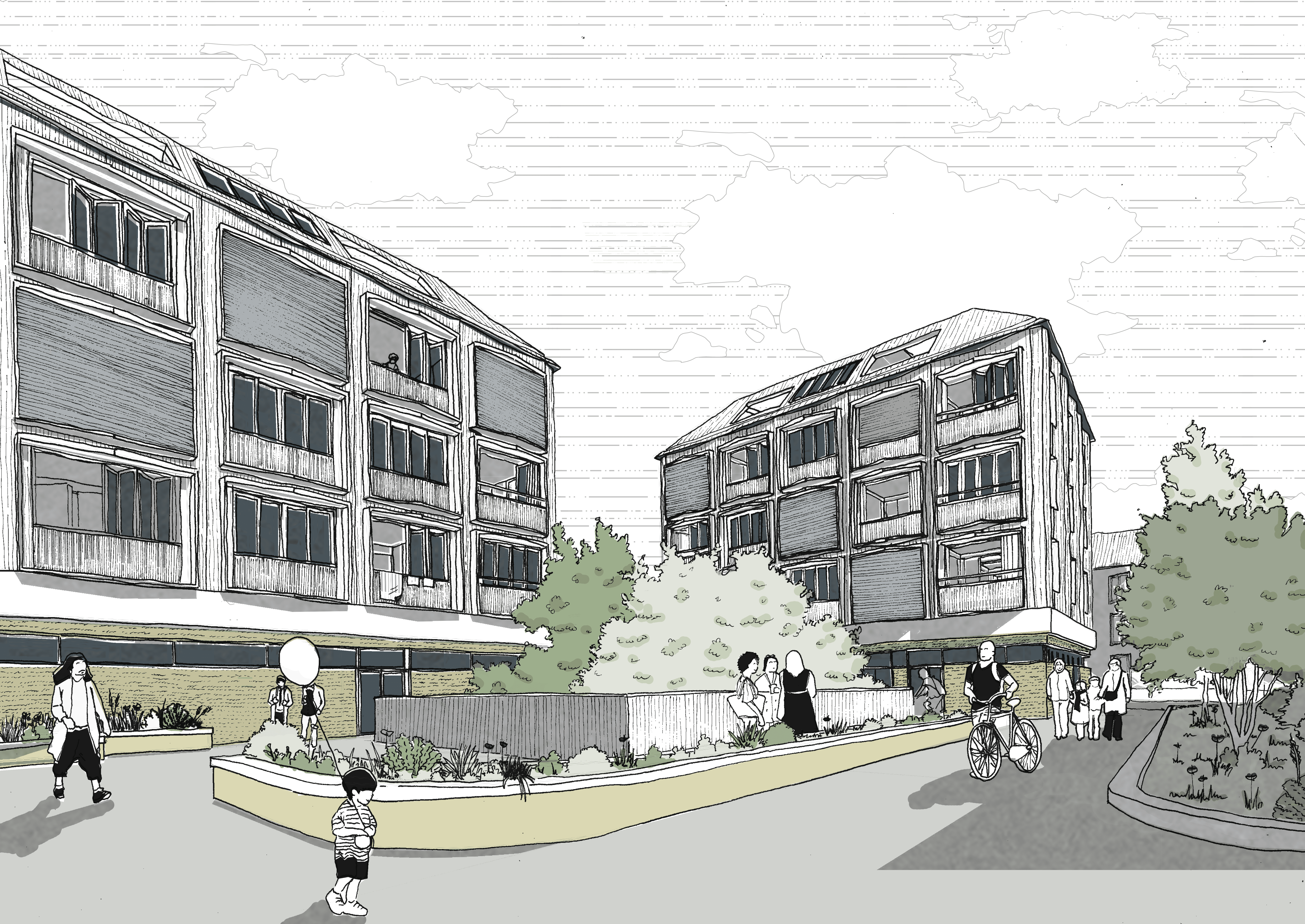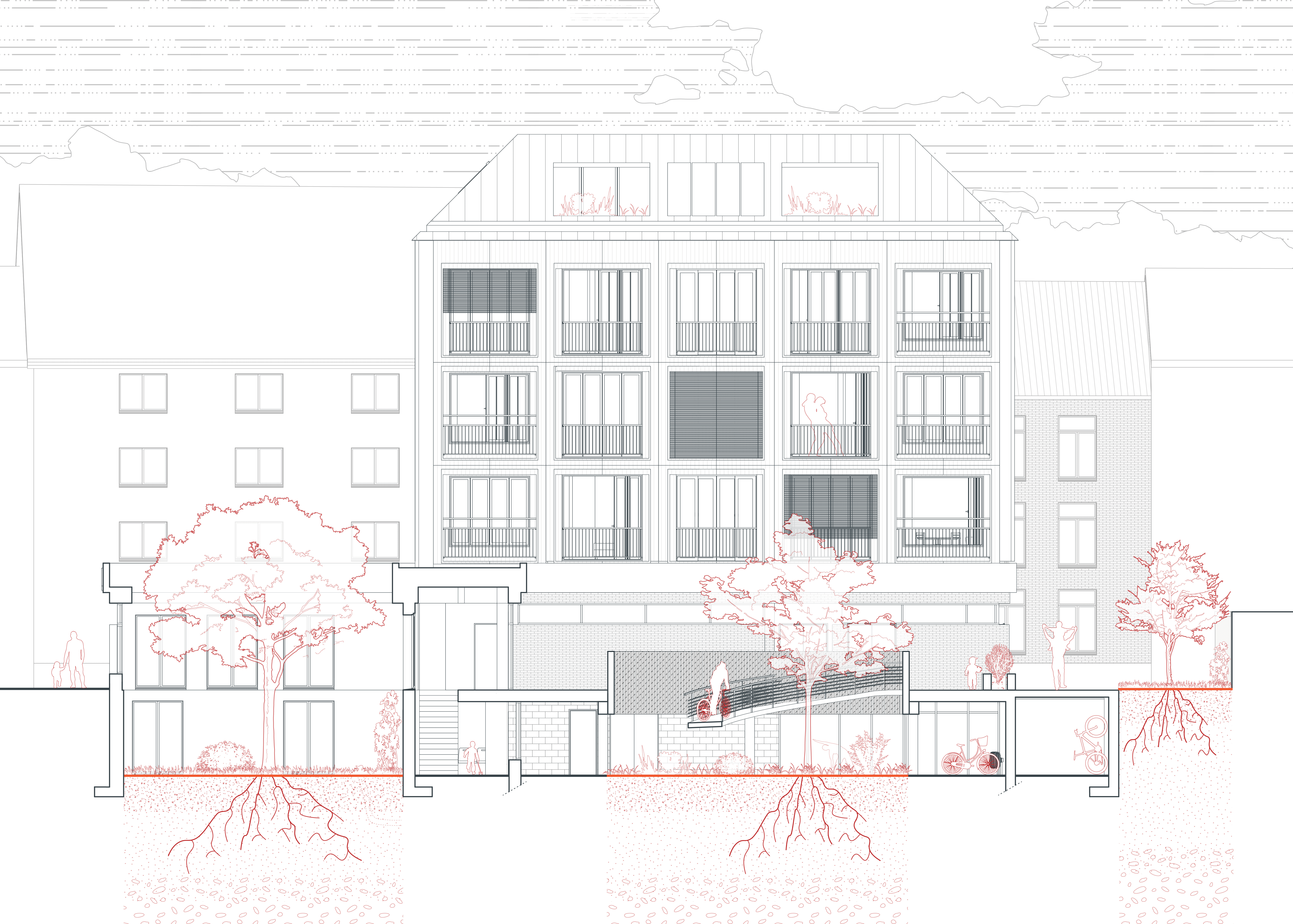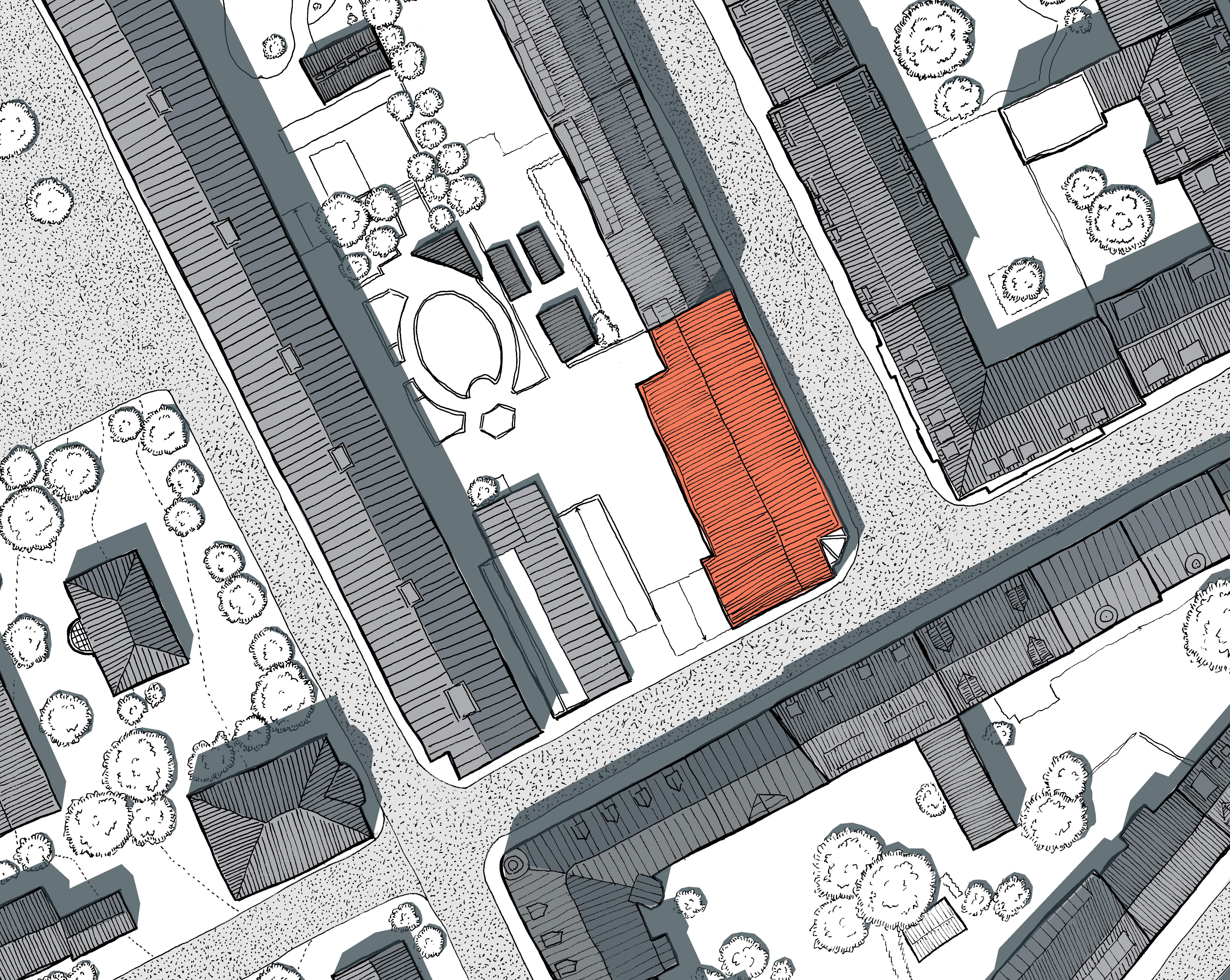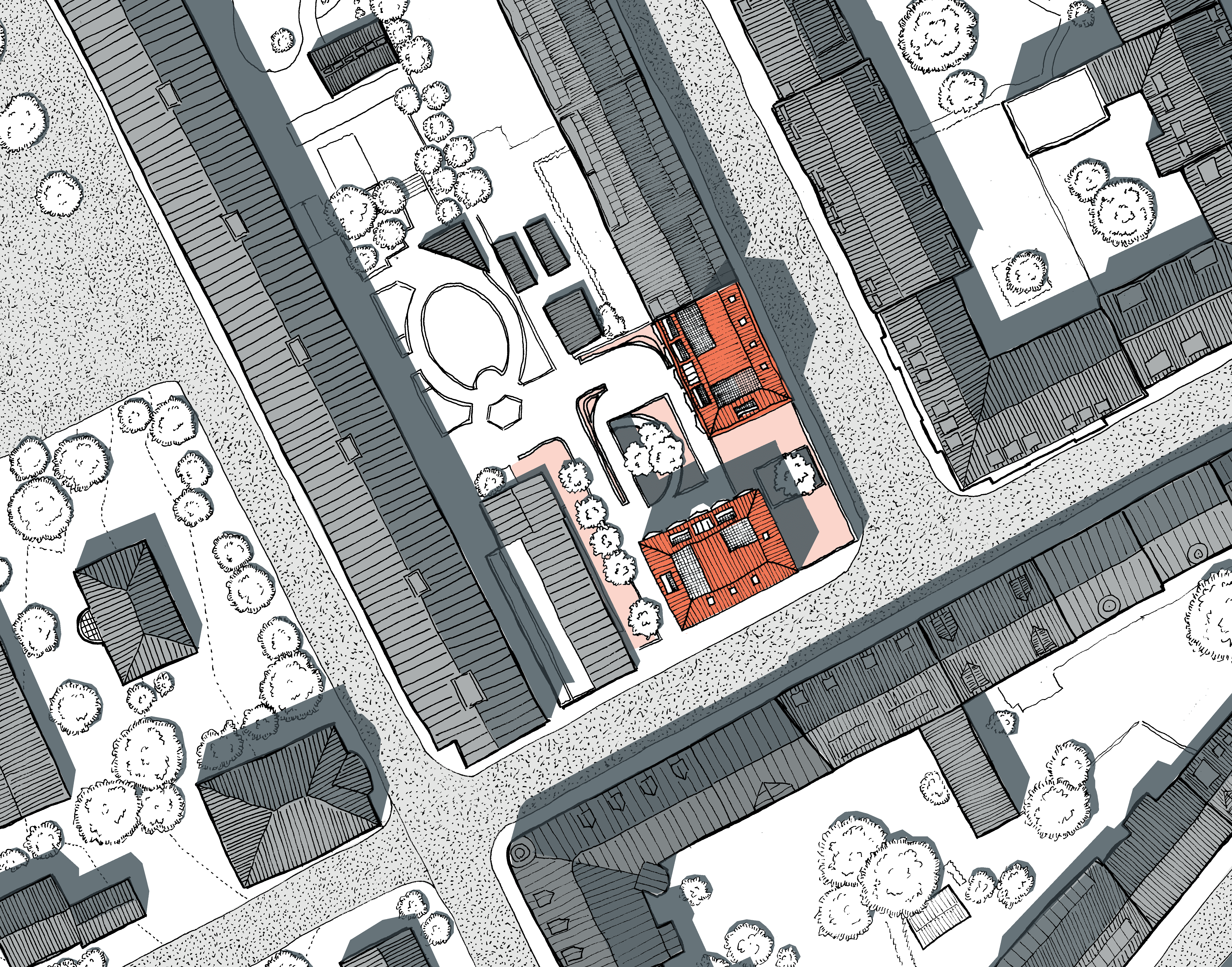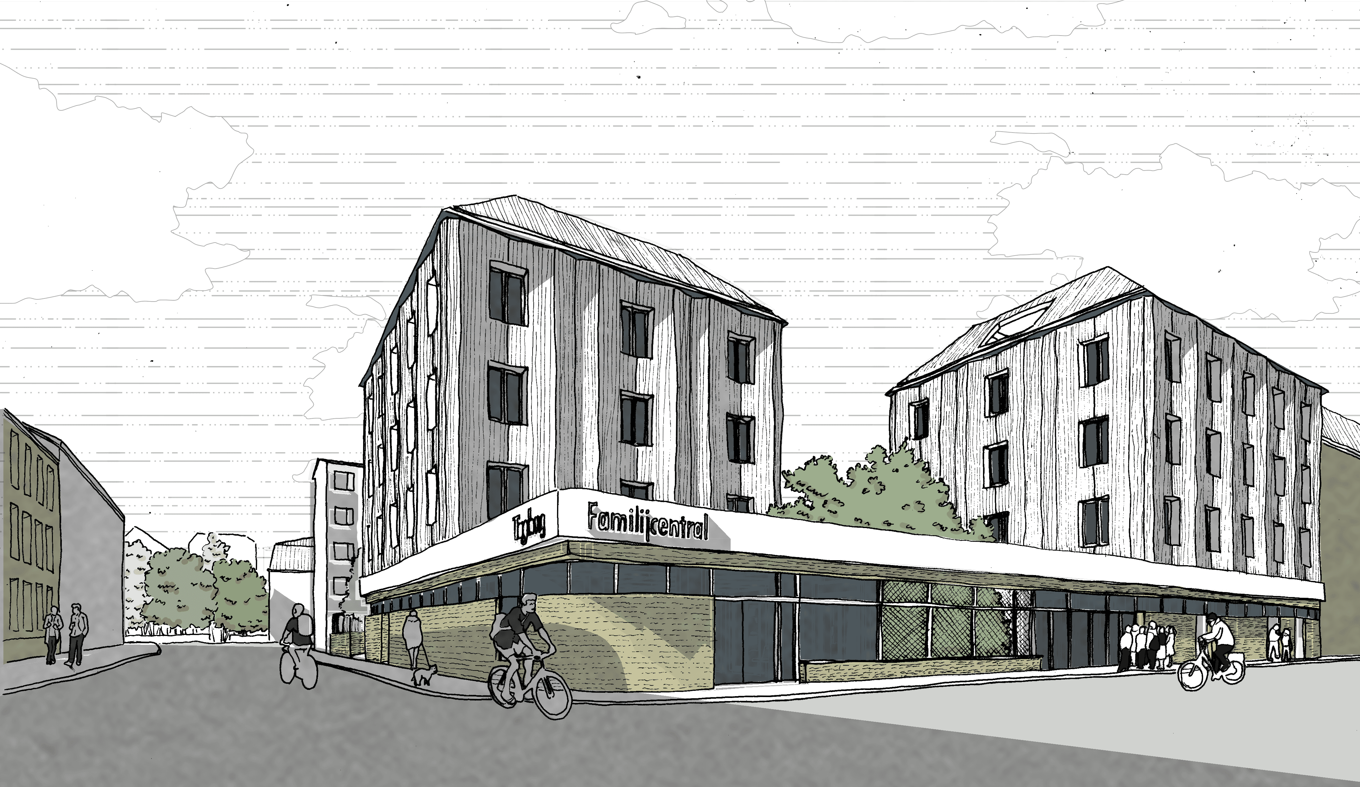 Le projet propose de densifier une parcelle aujourd’hui occupée par une petite supérette, dans le quartier de Tagaborg. Cette supérette est située dans un quartier vieillissant, dense et inadapté aux températures estivales. Elle fait face à des bâtiments ayant une forte valeur patrimoniale pour la ville, malgré son aspect banal et ordinaire. Elle a aussi la particularité d’être construite sur une dalle de parking en sous-sol, mise en commun avec les bâtiments voisins. Il nous a donc paru nécessaire de penser une morphologie qui rende service aux voisins, en n’occultant pas les avantages de lumières et d’air apportés par ce vide. D’amener une nouvelle population plus jeune, dans un quartier vieillissant grâce au modèle de la coopérative. De construire sur une dalle existante, réservoir de CO2, bien que la structure soit difficilement transformable. Et enfin d'amener des qualités de vie et climatiques qui n'existent aujourd'hui pas à Hlesingborg.