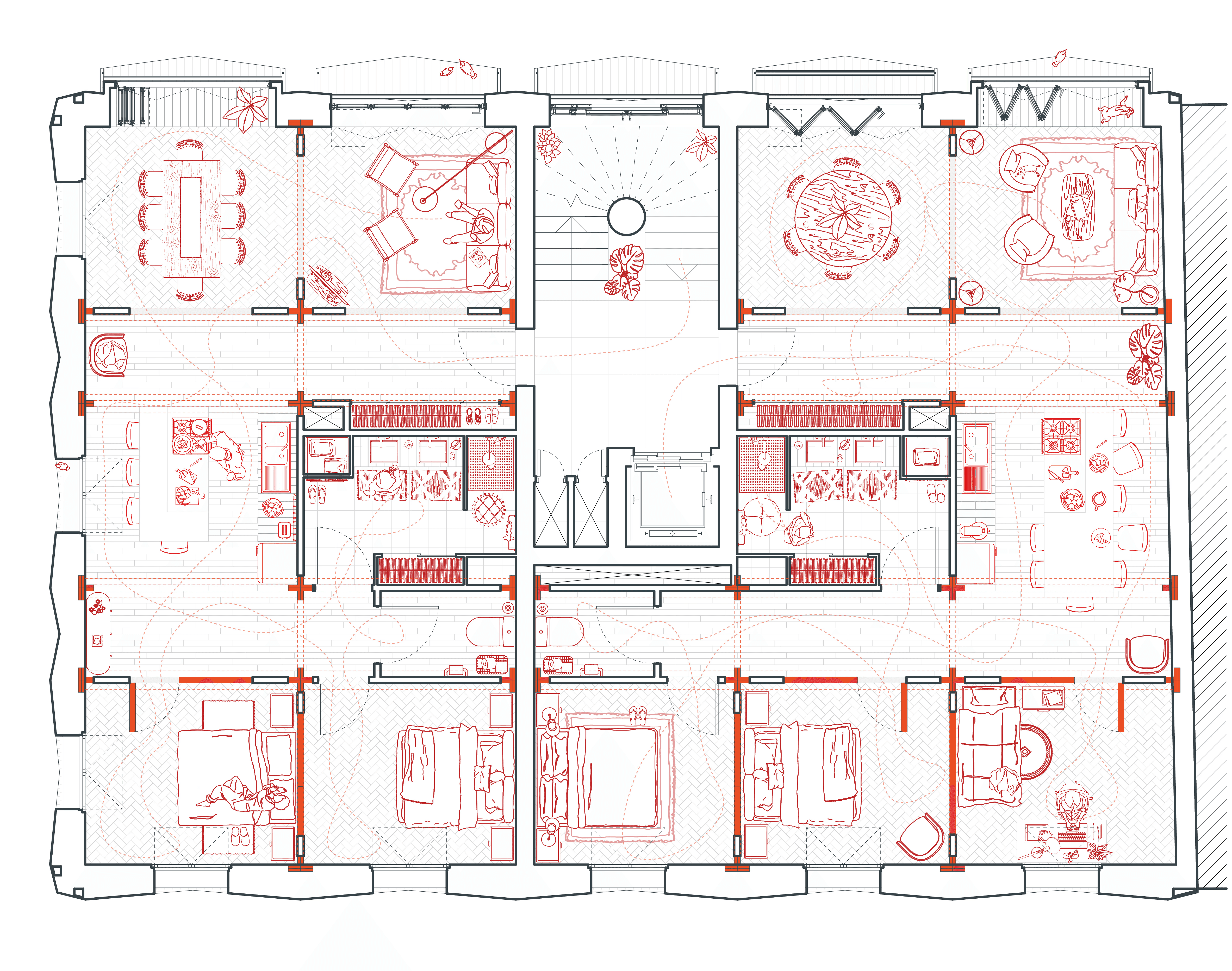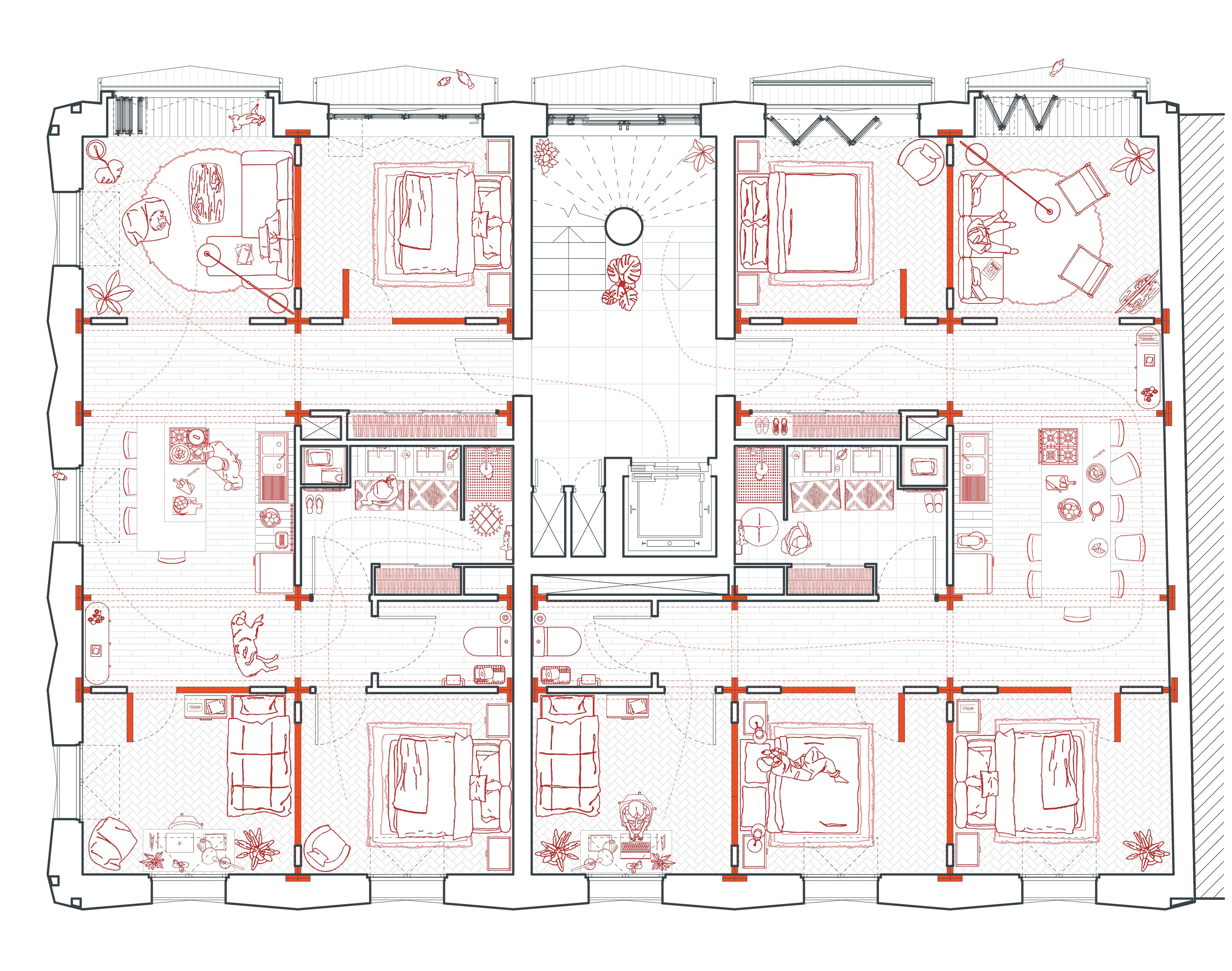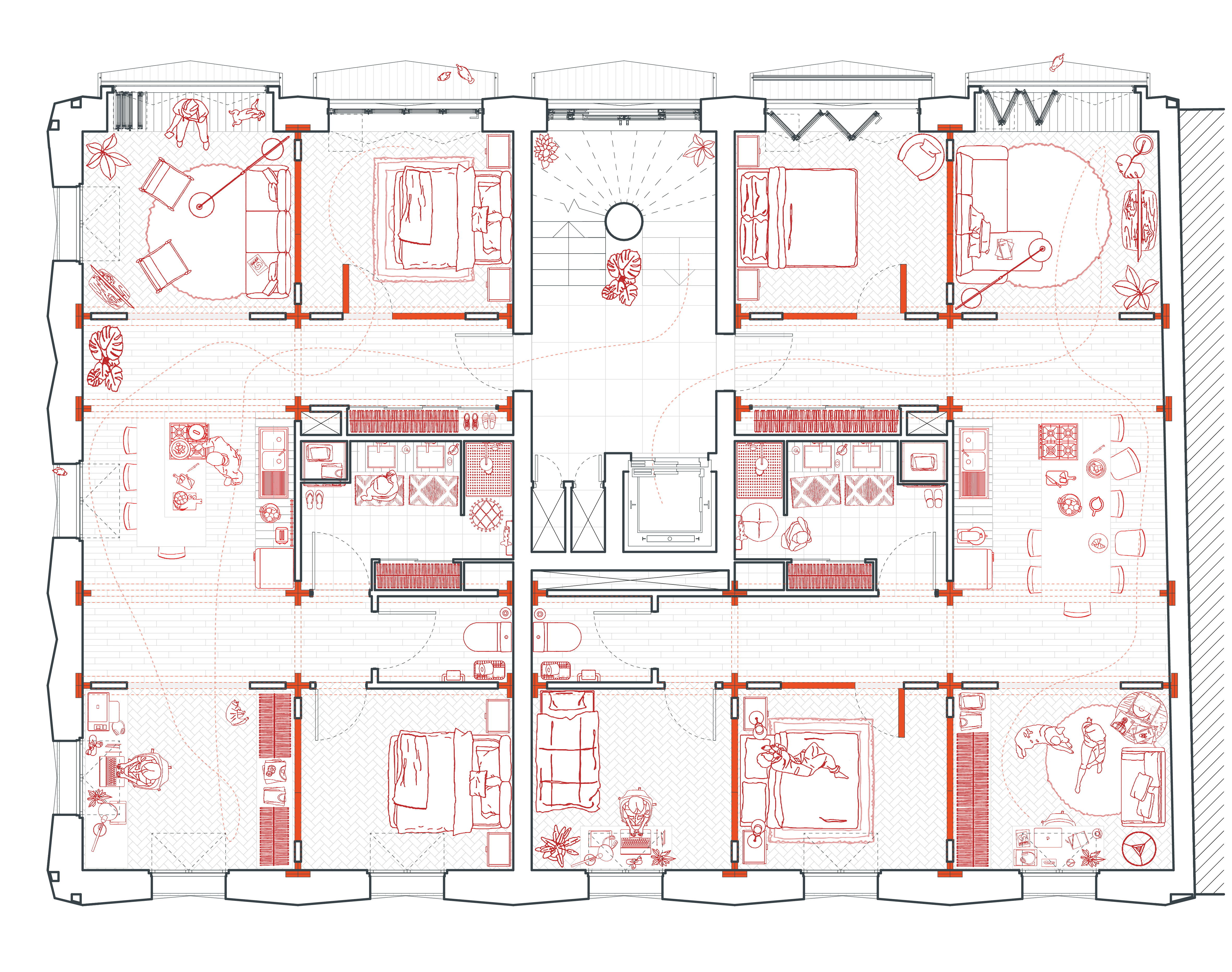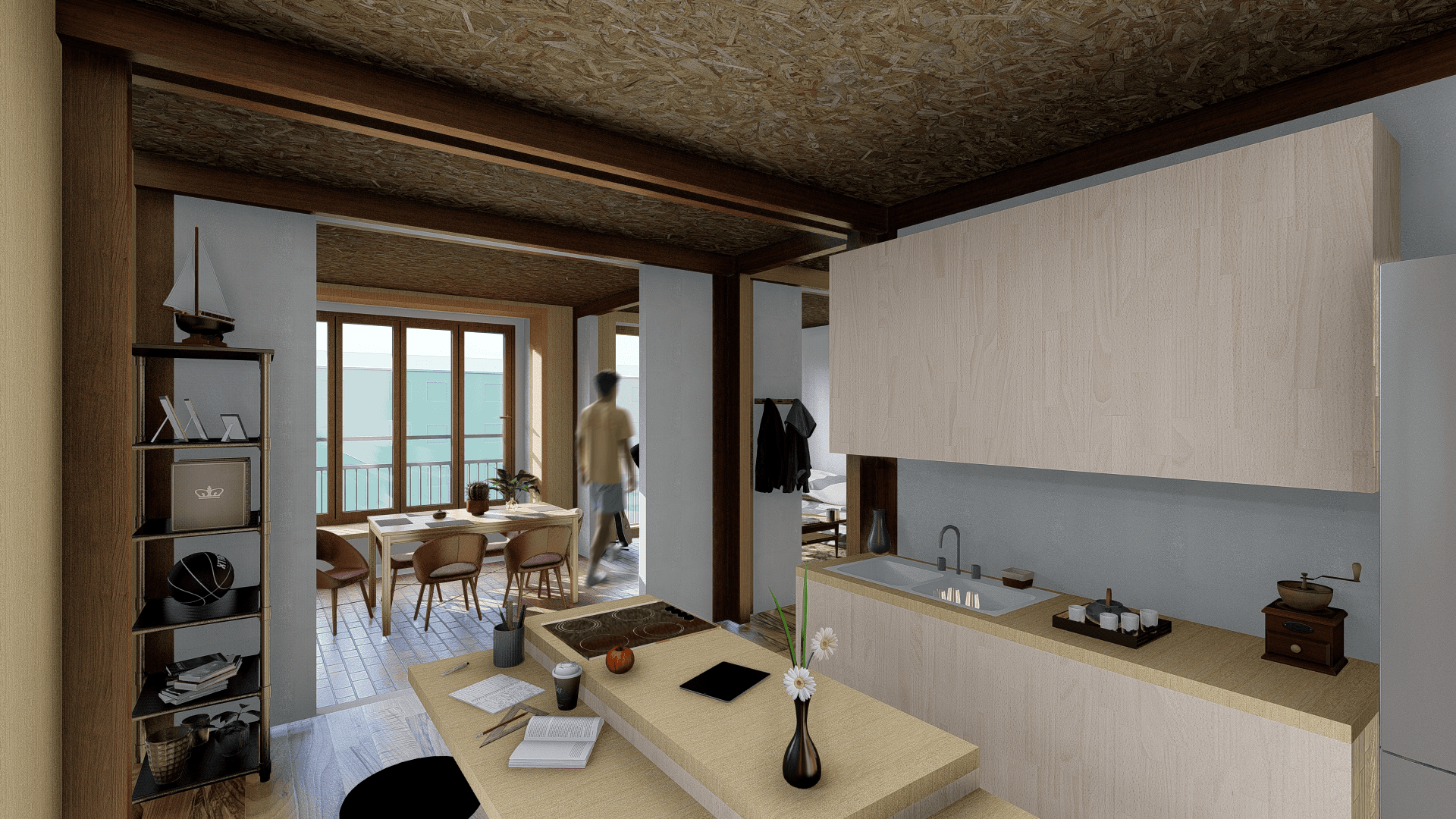 Ces espaces sont au cœur du projet, les qualités que nous avons cherché à y amener sont issues d’une démarche de recherche sur les habitats scandinaves. Plus en détail, un logement est tramé par sa structure, qui rythme l’espace et crée des pièces de même dimensionnement au sein du logement. Entre les poteaux viennent des cloisons qui peuvent être montées ou démontées, et s’ouvrir pour créer des portes ou des murs pleins. Ce systèmes de pièces réversibles permet une variation des usages, entre pièces de vie et chambres, ce qui permet différentes organisations d’un même logement, pour accompagner l’évolution d’un foyer ou s’adapter aux saisons, par exemple en rendant une grande partie du logement traversant ou en créant plusieurs petites pièces fermées et plus faciles à chauffer.
